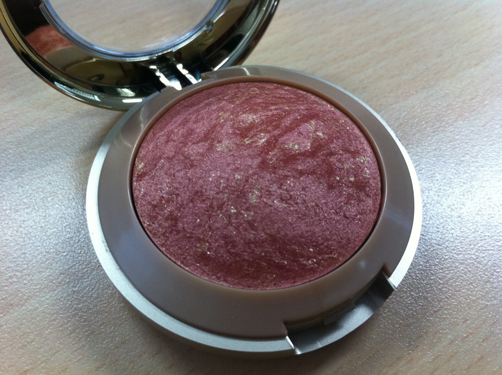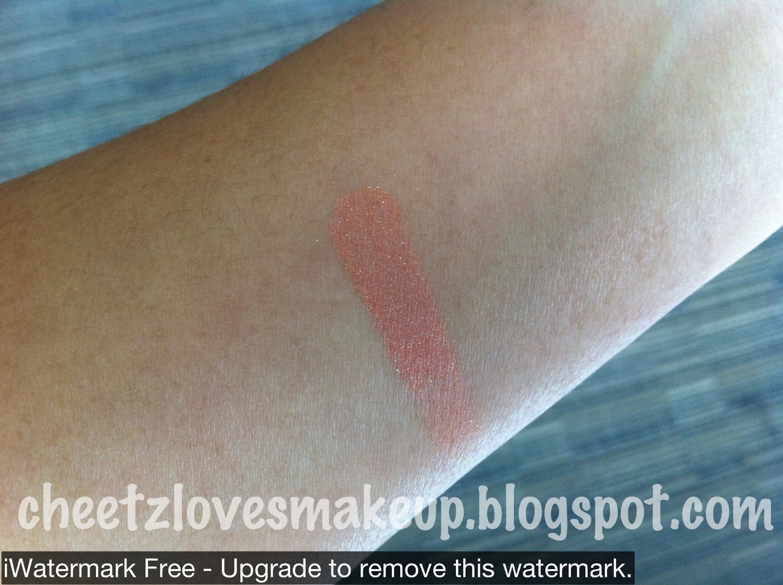 The color describe is pink and gold shimmer, but i think it is not pink blush. But is more like a soft coral peach with golden shimmer to me. The shimmer is fine. When i use this, my face looks fresh with a healthy glow and i don't need a highlight because the golden shimmer makes my face as if i'm wearing one. Overall, i like it. I'm not a fan of shimmer blush but this one is a keeper. You can purchase this blush at US Drugstore or Amazon.com.
